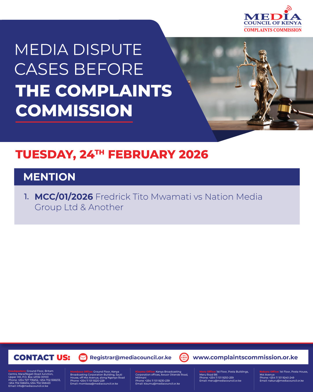 Cases comming up before the Media Complaints Commission on 24th February, 2026